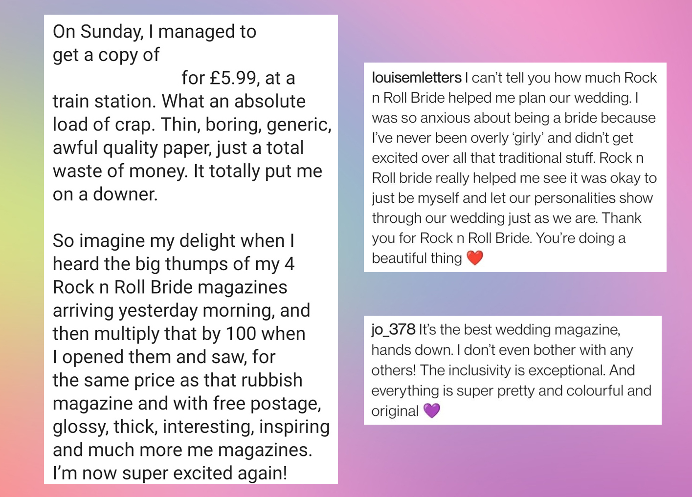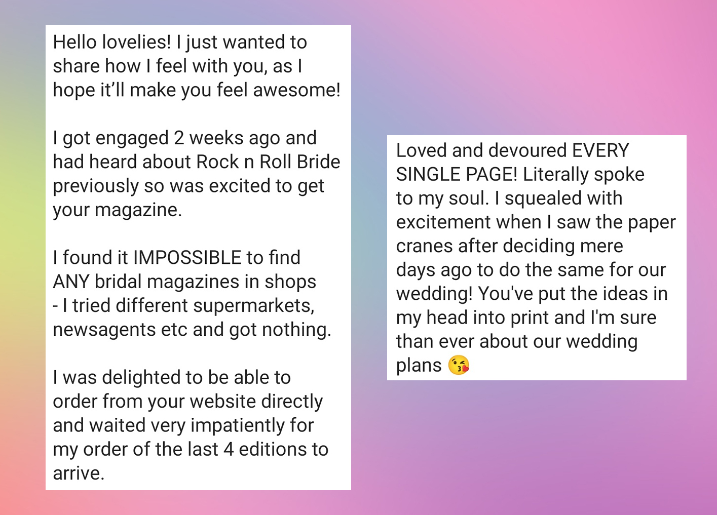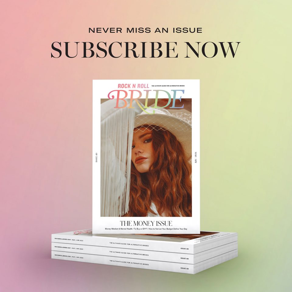 Want your regular fix of Rock n Roll Bride without having to remember to order it every time a new issue drops? Why not subscribe and get every new issue effortlessly delivered to your door? All payments are processed securely through PayPal on a rolling basis which means there's no big upfront fee, just £9.99 (plus shipping if you are outside the UK) every other month for as long or as short as you like.
