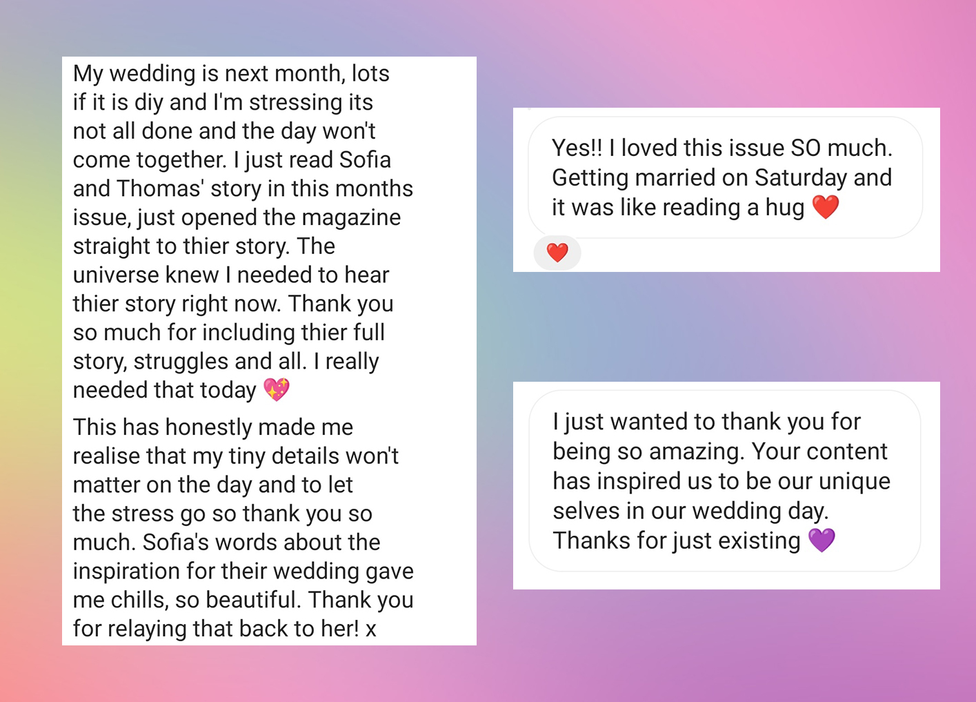 Over 100 pages of real wedding inspiration Advice articles from a range of wedding experts An exclusive fashion editorial ...And so much more!
